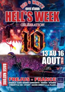 Du jeudi 13 au dimanche 16 août 2026, la Base Nature François Léotard à Fréjus s’animera au rythme des moteurs, du rock et des rencontres pour la 10ᵉ édition de la Hell’s Week.